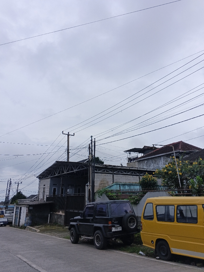 A wide-angle exterior photograph captures a street scene under an overcast sky, purportedly located in the city of Шчыткавіцкі сельскі Савет, Belarus. The upper half of the frame is dominated by a light grey, cloudy sky crisscrossed by numerous black utility wires suspended from multiple utility poles. In the mid-ground, a two-story building with a grey facade and an exposed-rafter roof structure is prominent on the left, featuring multiple open ground-level entrances. To its right, other residential-style buildings are partially visible, including one with a light blue section of wall and a red-tiled roof. A low, light-colored fence with ornamental elements runs along the right side, fronting these properties. Green and yellow-flowering foliage grows behind this fence. The foreground features a paved asphalt road on the left, with a dirt or grassy shoulder alongside it on the right. Three vehicles are parked on or near the shoulder. A black, two-door SUV (Daihatsu Taft or similar) is parked facing away from the viewer, displaying a rear-mounted spare tire and a license plate reading 'F 1059 ZF'. Immediately behind it, a yellow van is also parked, with only its rear-right side visible. A white vehicle, possibly a truck, is partially visible parked further down the street on the far left. No individuals are present in the scene, and no specific actions or interactions are depicted.