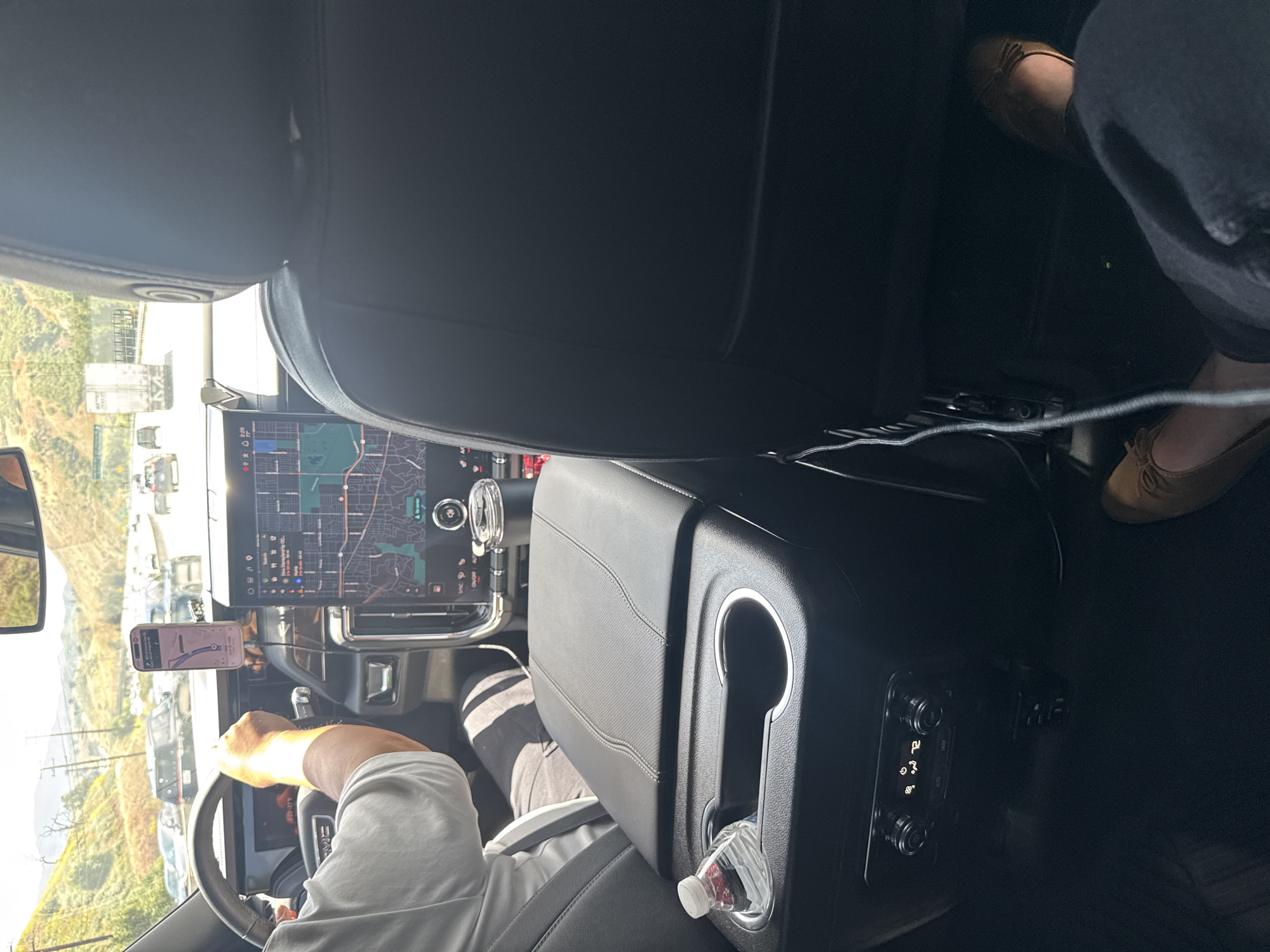 A view from the back seat of a GMC Yukon SUV shows the driver, a person with brown shoes, and a navigation system displaying a map
