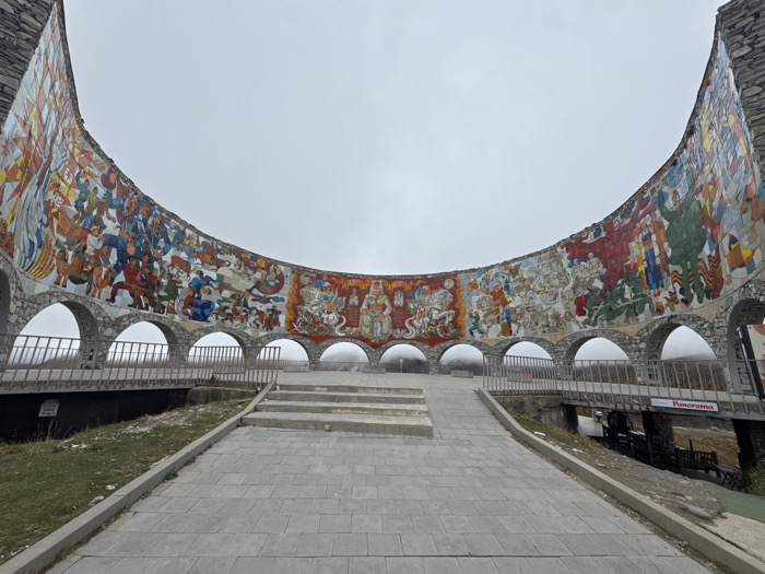 The image displays the Russia–Georgia Friendship Monument, located on the Georgian Military Road near Gudauri, Georgia. The central subject is a large, semicircular stone and concrete structure featuring a monumental mosaic mural on its inner concave surface. The mosaic, composed of numerous colorful ceramic tiles, depicts a rich array of scenes, including historical events, mythological figures, and daily life, utilizing vibrant reds, blues, greens, yellows, and whites. Below the mosaic, a series of stone arches form an open arcade, beyond which a grey metal balustrade runs along the edge of a viewing platform. In the foreground, a wide pathway constructed of light grey rectangular pavers leads up a short flight of steps to the central viewing platform. The ground slopes downwards on either side of this pathway, revealing sparse green grass on the left. The mountainous landscape visible through the arches and above the balustrade is largely obscured by dense fog or low clouds, merging with an overcast, uniformly grey sky. A white sign with the word "Panorama" in black lettering is affixed to the railing on the lower right side. The scene is devoid of human presence or activity.