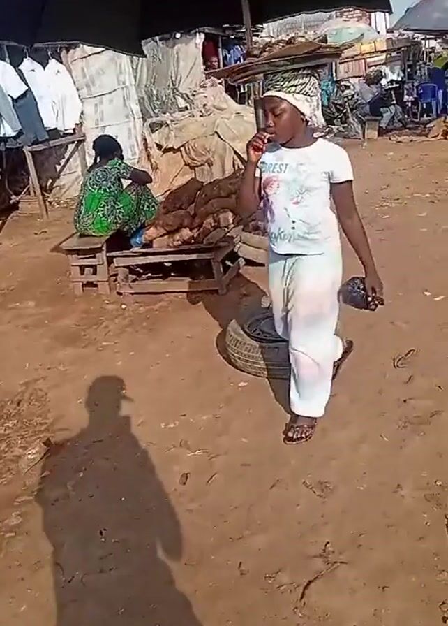 n outdoor market scene. A young person in a white shirt and pants with sandals walks past a stall selling what appears to be yams, under a large umbrella. Another person in a patterned dress sits at the stall. The camera then pans to show a wider view of the market, which includes other stalls under umbrellas. People walk around. In the distance, a sign reads "Kogi International Market Lokoja." Several vendors sit under their umbrellas, selling fruits and vegetables. The ground is dirt and littered with debris.