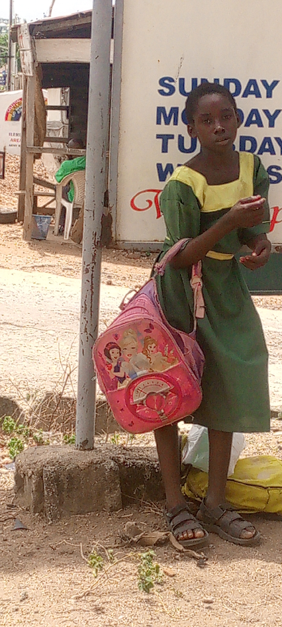 A young girl in a green and yellow school uniform with a pink backpack stands on a sandy, dirt-covered ground next to a weathered pole and a sign with lettering indicating days of the week