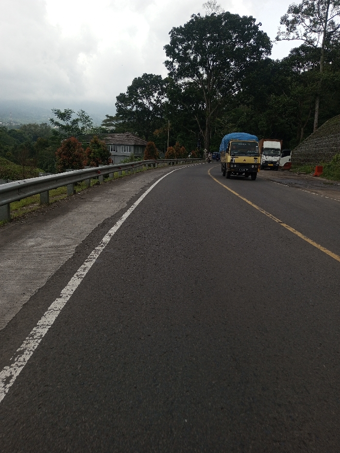 The scene depicts a curving asphalt road in Khajuripada, India, under an overcast sky. The road's left edge is marked by a solid white line, adjacent to a textured concrete shoulder and a grey metal guardrail. Beyond the guardrail, a verdant slope descends, leading to a distant light grey building with a reddish-brown tiled roof situated amidst trees, overlooking a valley with faint mountains in the background. On the right side of the road, a yellow Mitsubishi Fuso light truck, carrying a blue-tarped load, travels away from the viewer. Behind this truck, a white box truck or bus is stationary, parked off the road next to a stone retaining wall and dense green foliage. An orange traffic cone is visible near the parked white vehicle. No distinct human figures or specific interactions are clearly identifiable.