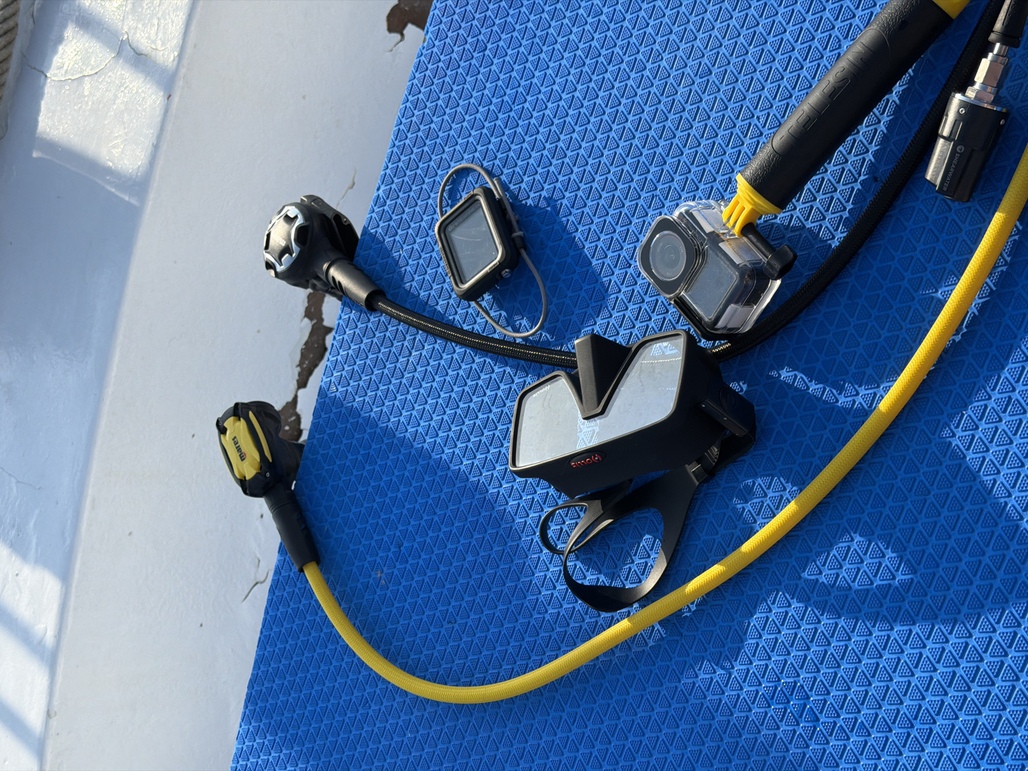 Diving equipment is displayed on a textured blue anti-slip mat, likely on the deck of a boat, under direct sunlight