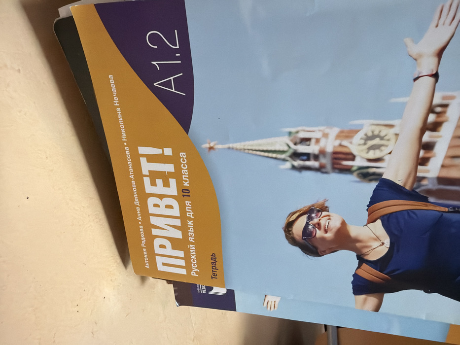- "The image displays a textbook titled "ПРИВЕТ!" (Hello!) for "Русский язык для 10 класса" (Russian language for 10th grade), level A1" by FM-Orb3u1, licensed under CC BY 4.0