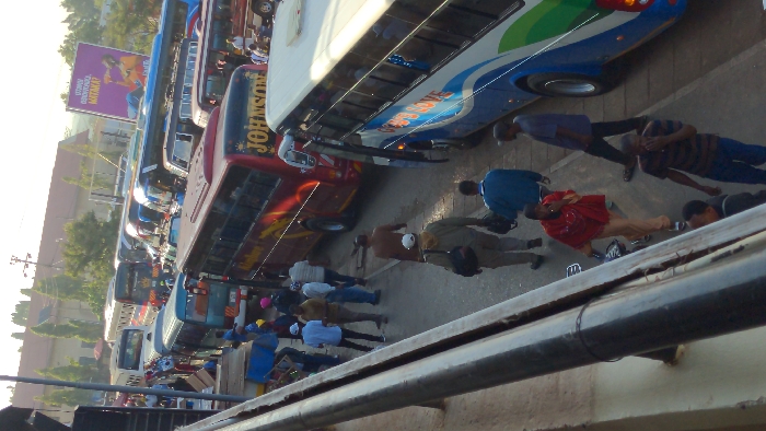 Buses line a parking area, with people milling between them. Some individuals appear to be boarding or exiting the vehicles. A billboard stands in the background, next to a building. Overhead pipes traverse the scene. The buses are varied in color, including red, white, and blue. "JOHNSON" is visible on the side of one bus.