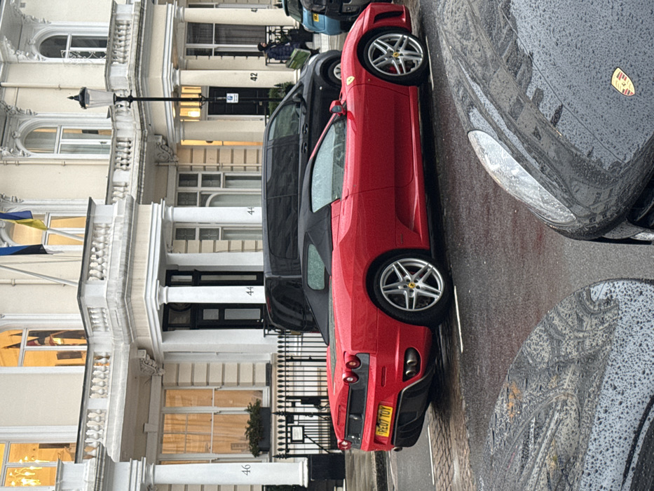 The image captures an urban street scene in Holland Park, London, United Kingdom, specifically featuring a row of classical terraced buildings numbered 46, 44, and 42. Above building number 44, the Union Jack and Ukrainian flags are visible on flagpoles. In the midground, a red Ferrari F430 Spider convertible, bearing the UK registration plate "RE07 TOY" and equipped with a black soft top, is parked curbside. The vehicle's surface and the dark asphalt road are wet with visible water droplets. Behind the Ferrari, a dark Mercedes-Benz Vito van is parked, with a partially visible light blue compact car further back on the right. In the immediate foreground, the wet hoods of two dark-colored vehicles are visible, with a Porsche badge identifiable on the vehicle in the bottom right. One individual, dressed in dark clothing and carrying a green bag, is visible walking past building 42 in the background. An ornate black street lamp stands between buildings 42 and 44. Interior lights are illuminated in some of the building windows.