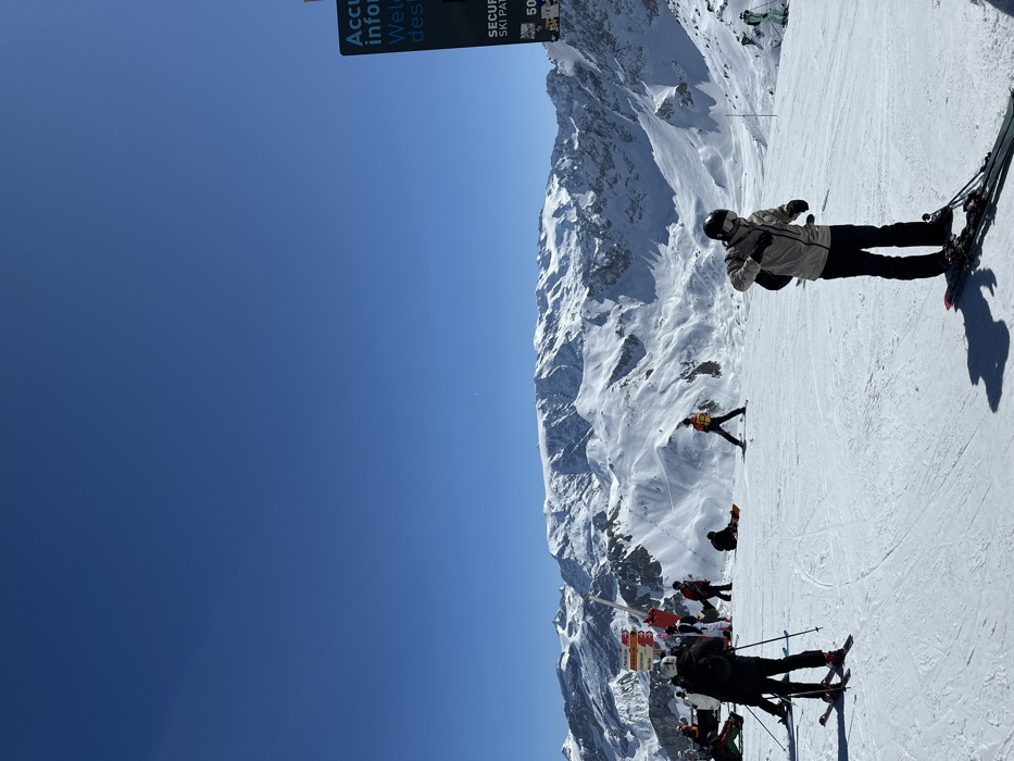 This image depicts a snow-covered mountain ski slope under a clear blue sky in Les Allues, France. In the foreground-right, a person wearing a light beige ski jacket, black ski pants, and a black helmet with goggles stands on skis, adjusting a glove on their left hand. To their left, another individual in dark ski gear stands with skis and poles, facing away from the viewer. In the mid-ground, multiple individuals are present. Towards the left, a cluster of skiers and snowboarders is visible near red and white directional signs, one of which partially reads "FIN DE LA PISTE" (End of the slope). One person is seated on a snowboard, and another stands on skis wearing an orange vest. A thin rope or wire spans horizontally across the mid-ground. On the far-right, a partial dark blue sign displays text including "Accueil information," "Welcome destination," and "SECURE SKI PATROL." The background features expansive, snow-covered mountains with visible rock formations and ridges under a bright, cloudless sky, indicating an alpine environment. The ski slope itself shows groomed snow with visible tracks.