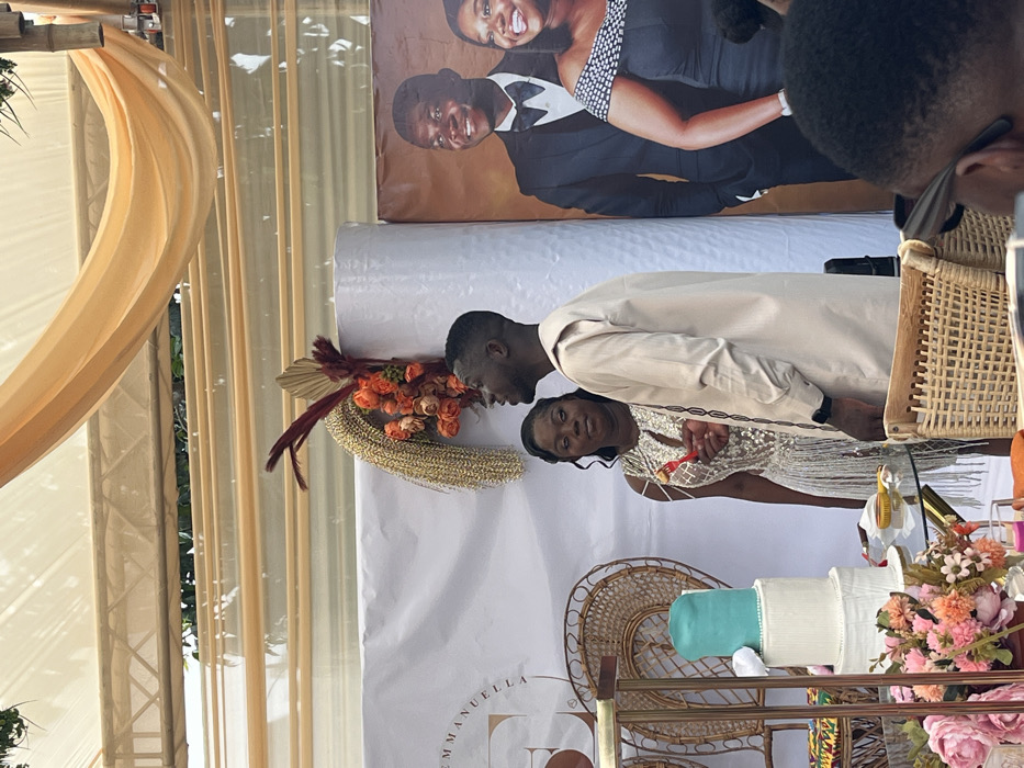 The image depicts a celebratory event, likely a formal gathering such as an engagement or wedding reception, set in what appears to be a semi-enclosed outdoor or tented venue in Kumasi, Ghana. The specific location within Kumasi is not discernable. In the midground, a man and a woman are positioned in front of a multi-tiered cake and decorative backdrops. The man, with short dark hair and a beard, wears a light beige or cream-colored traditional long-sleeved tunic with dark embroidery on the left shoulder/neckline and a dark watch on his left wrist. He is looking upwards and slightly to his left. The woman, standing to his left, has dark, wavy hair and wears a sparkling, light-colored, sleeveless dress featuring thin straps, a cutout detail on the chest, and fringes or beads on the skirt. She holds a small, red-handled utensil, possibly a cake knife, in her right hand and is looking towards the man. To their left, a three-tiered cake is presented on a glass-topped table with golden supports. The top tier is teal, and the lower two are white with textured icing. Pink and peach floral arrangements are visible on the table's front edge. Behind the cake and individuals is a large white banner with partial text "EMMANUELLA" and several circular, wicker-like decorative elements. A prominent vertical floral arrangement featuring golden dried grass, orange/peach flowers, and dark red feathers is affixed to the white banner. To the right of the two individuals, a large brown-toned banner displays a smiling man in a dark suit and bow tie alongside a smiling woman in a dark, off-the-shoulder dress with white patterned trim, presumably the same couple. The ceiling above features draped, light orange fabric and visible metal support beams, consistent with a large tent or temporary structure. In the lower right foreground, the back of a person's head, wearing glasses, is partially visible, indicating an observer in the immediate vicinity.