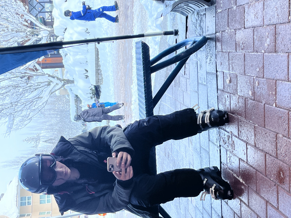 A person in ski attire, including a helmet and goggles, sits on a bench, holding a smartphone. The person is wearing ski boots. In the background, others are walking in the snowy environment. The scene is outdoors, with snowy trees and buildings visible. Paved brick is underfoot. A snow shovel stands to the side.