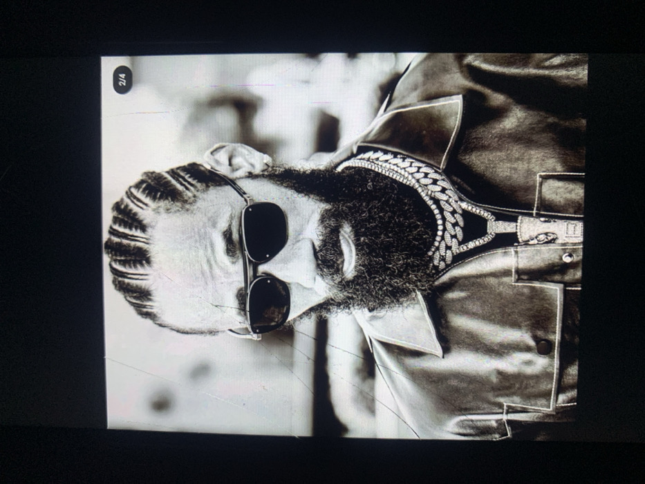 A photograph of a digital screen displays a black and white portrait of an adult male. The screen exhibits multiple hairline cracks. The male subject, positioned from the chest up, has cornrow braids and a dense, dark beard. He wears dark aviator-style sunglasses. Around his neck are multiple layered, diamond-encrusted necklaces, including a prominent Cuban link chain and a large pendant. His attire includes a dark, possibly leather, collared jacket. The subject's gaze is directed slightly downwards. The background behind the subject is out of focus and indistinct, providing no discernible environmental details. An overlay in the top right corner of the displayed portrait reads "2/4". The image contains no visual cues or contextual information to indicate a location within the city of Rafin Par, Nigeria, or any other specific geographical area.
