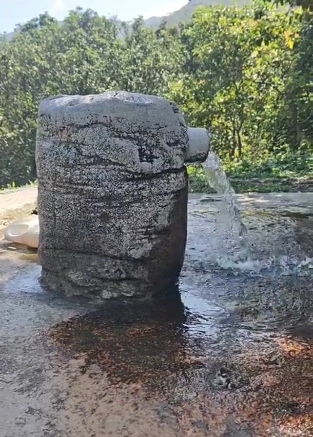 water flowing from a concrete structure with a pipe into a shallow concrete pool. The structure is cylindrical and weathered, and the water is clear. The pool is surrounded by a concrete platform, and beyond the pool, there's a lush green forest with tall trees. The day is sunny, and the atmosphere is peaceful.