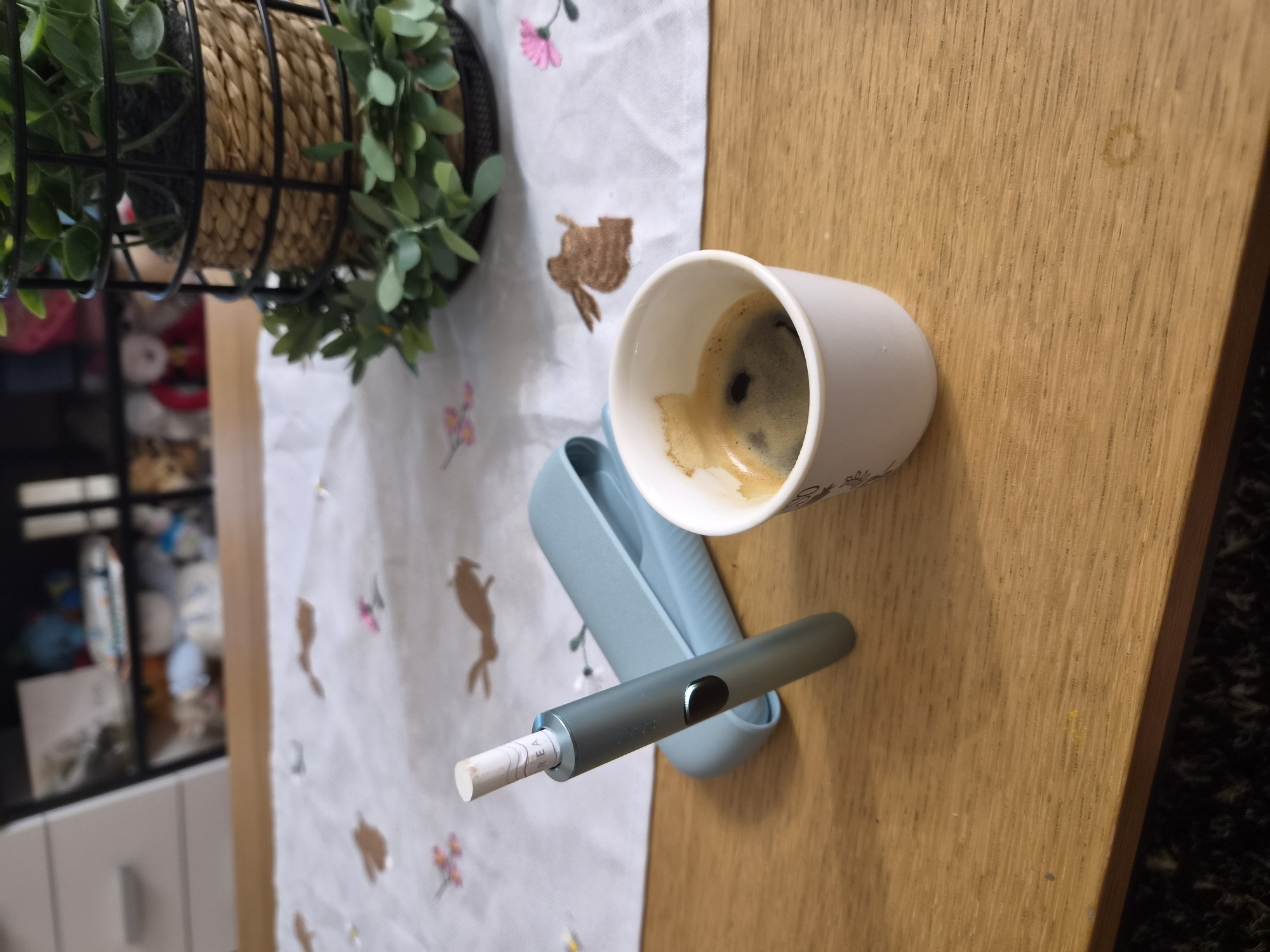 This image depicts a static indoor scene on a light brown wooden table located in Pernik, Bulgaria. A white fabric table runner, embroidered with brown rabbit/hare figures and pink floral designs, covers a significant portion of the table surface. A light blue-grey electronic heating device, consistent with a heated tobacco product, stands upright on the runner with a white tobacco stick inserted into its top; the stick displays visible text including "REA". An open, matching light blue case for the device rests horizontally beside it. To the right, a white ceramic cup contains a dark brown liquid with a visible crema layer and two dark particles, consistent with espresso coffee. In the upper right quadrant of the image, a decorative artificial plant is housed within a black wire cage with a woven brown base, further adorned with artificial green foliage. The wooden table surface shows prominent grain, a faint light yellow stain, and a subtle ring mark. The background, largely out of focus, reveals a white cabinet on the left and a black shelving unit containing blurred items such as books, boxes, and various small decorative objects.