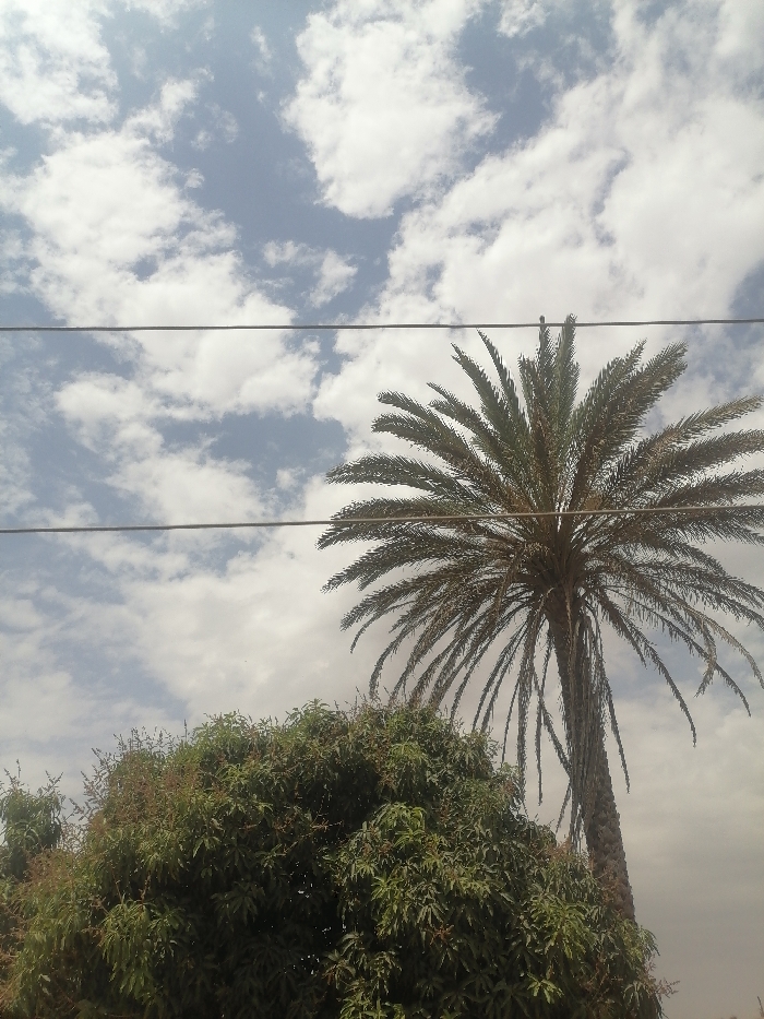The scene, located in Barakin Lerawi, Nigeria, depicts an outdoor environment under a partially cloudy daytime sky. The upper two-thirds of the image features a light blue sky interspersed with scattered white cumulus clouds. Two dark, thin, parallel utility lines or wires traverse horizontally across the mid-ground of the frame. On the right side, a tall, slender palm tree with visible fronds extends from just below the lower wire to near the top edge of the image. In the lower-left quadrant, a dense, green deciduous tree with abundant foliage occupies the foreground, its top appearing beneath the horizontal wires. No people or animals are present, and no actions or interactions are depicted.