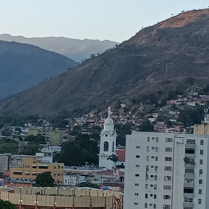 A cityscape under mountains fills the frame. A bullring is in the lower left. Taller buildings, including a white apartment complex and a white church with a cross-topped steeple, punctuate the skyline. The mountains are brown and sparsely vegetated. Numerous small buildings dot the lower slopes of the mountains, blending into the landscape. The sky is light blue, suggesting dawn or dusk.