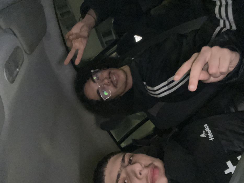 Two individuals pose for a close-up, slightly angled shot. One, with curly hair and glasses, holds up a peace sign, clad in an Adidas jacket. The other, with closely cropped hair, wears a dark jacket with visible lettering. They appear to be inside a vehicle, with a dimly lit interior visible behind them. Both individuals look towards the camera.