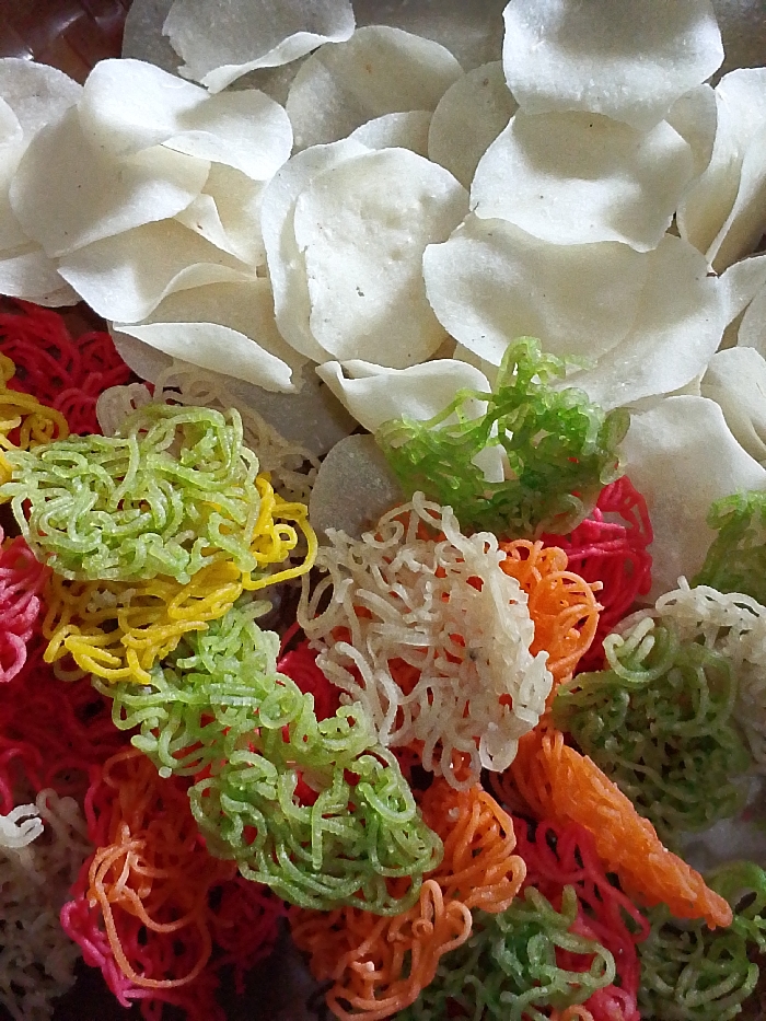 This image captures a close-up, top-down view of a variety of uncooked dry crackers in Gadingrejo, Indonesia. The upper portion of the frame is filled with numerous off-white, oval or disc-shaped crackers, layered and overlapping. These items exhibit a thin, flat profile with slightly uneven or wavy edges. Below them, occupying the lower half of the frame, is a dense cluster of smaller, brightly colored, squiggly or noodle-like crackers. These smaller crackers are intertwined and present in a spectrum of colors including red, pink, orange, yellow, light green, dark green, and translucent white. The overall scene shows a mixture of these two distinct types of dry, unexpanded food items. No individuals or specific environmental details beyond the food items are visible.