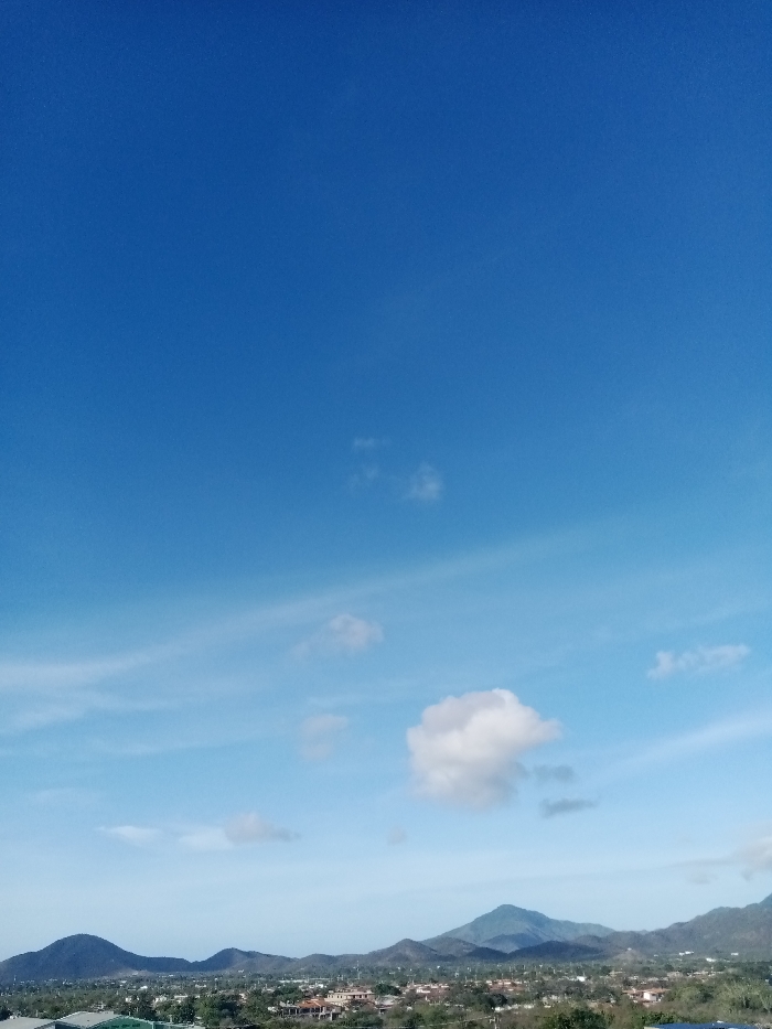 The image presents an elevated wide view of Altagracia, Venezuela, under a bright, clear blue sky. The upper two-thirds of the frame consists of a vibrant cerulean sky, featuring scattered wispy white clouds and a few isolated cumulus formations, with one prominent, distinct white cumulus cloud situated towards the lower-right quadrant of the sky section. The lower third of the image depicts an extensive urban and suburban landscape, characterized by numerous buildings with varied roof colors, predominantly reddish-brown, interspersed among abundant green trees and vegetation. This developed area stretches towards a distant horizon line formed by a series of dark green, undulating mountains and hills, which appear hazy in the distance. The scene is illuminated by strong natural daylight. No individuals, specific actions, or discernible objects are present within the captured landscape.