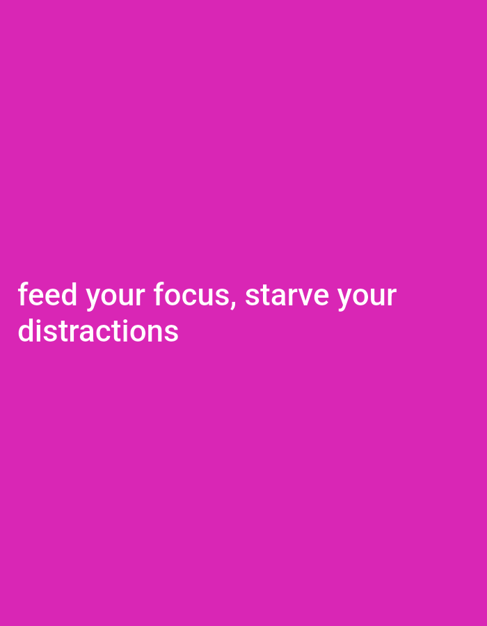 A vibrant magenta background displays a motivational message in white. The text reads "feed your focus, starve your distractions". The phrase emphasizes the importance of concentrating on goals while minimizing distractions, offering a simple yet powerful piece of advice. The bright color scheme and concise wording make the message visually appealing and easily memorable.