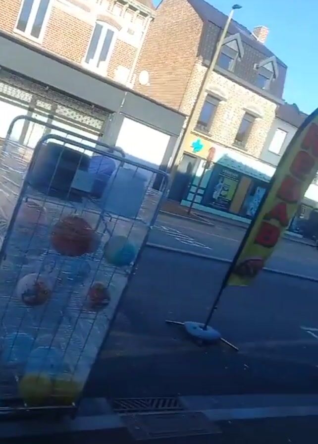 The video pans across a street in a town, showcasing various objects and establishments. The initial focus is on a metal cage-like structure wrapped in plastic, seemingly containing balls. Moving further down the street, a yellow and red "KEBAB" flag is visible. Further down, there's a shopping cart overflowing with what appears to be bread. The street has parked cars, buildings with brick facades and traditional architecture, and the sky is clear blue. The video ends back at the metal cage.