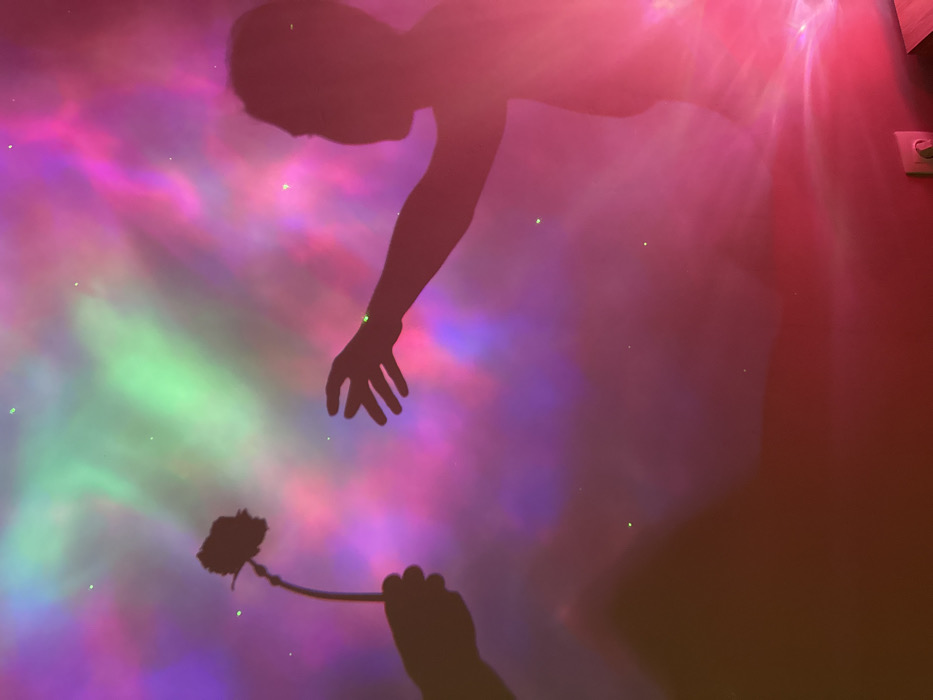 The scene is an indoor room in Unknown, Unknown, featuring a wall illuminated by projected light displaying vibrant pink, purple, and green swirling patterns interspersed with small green light points. Two dark human silhouettes are cast upon this wall. On the left, a hand silhouette holds a single stemmed flower, extending it towards the right. On the right, a second human silhouette, visible from the torso upwards and facing left, extends an open hand towards the flower. An electrical wall outlet is visible in the lower right corner. The interaction depicted is the offering and receiving of the flower.