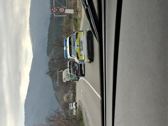 The image, captured from the interior of a vehicle, displays a two-lane asphalt road curving to the left, located in the city of Simitli, Bulgaria