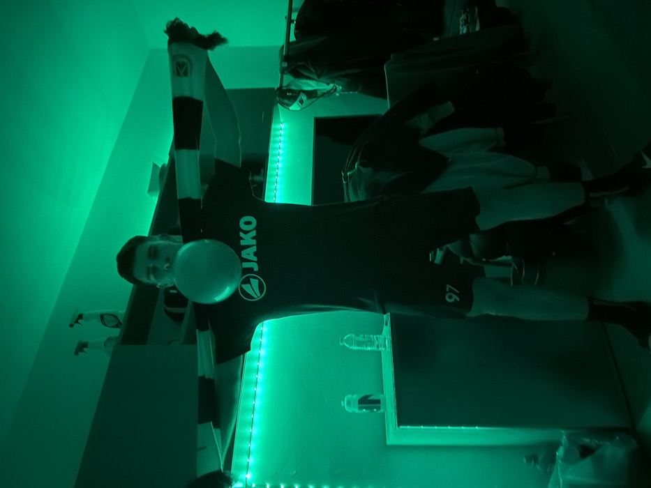 The image depicts an indoor scene saturated with green ambient lighting, presenting a single young male subject standing centrally. He is dressed in a dark short-sleeved athletic shirt bearing the white "JAKO" logo and an associated emblem on the chest, paired with dark shorts featuring the white number "97" on the left leg. Dark socks or footwear are visible. The subject's arms are outstretched laterally, holding a black and white striped scarf or banner taut across his chest and shoulders. A partially inflated, light-colored balloon is positioned directly at his mouth, and his cheeks are visibly puffed, indicating an action of blowing air into the balloon. The background shows a domestic environment, likely a room or dormitory. Above the subject's head, a shelf or cabinet is visible, holding two spray bottles on its left side. A horizontal strip of bright green LED lights runs along the wall below this shelf. To the subject's left, on a lower surface, two plastic bottles are present: one dark sports bottle with a white graphic and one clear water bottle. To the subject's right, additional clothing items or fabric are draped over an indistinct piece of furniture. The walls and other surfaces appear uniformly green due to the dominant lighting, obscuring their original colors. While the prompt indicates the city as Sofia, Bulgaria, no specific landmarks, signage, or unique architectural features are discernible within the image itself to forensically confirm this location. The scene is consistent with an interior private residence or room within a city.