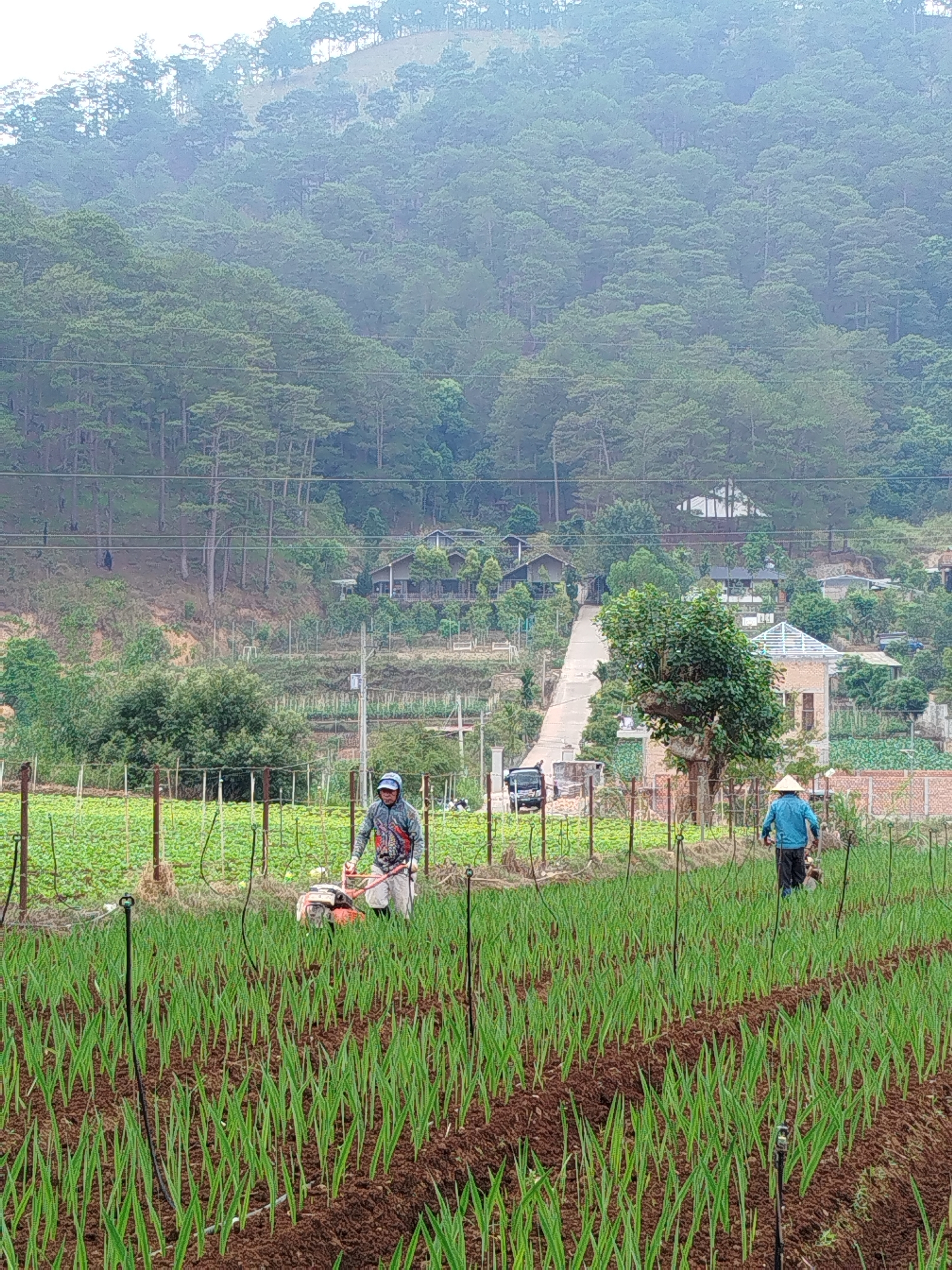 In Hiệp Thạnh, Vietnam, a verdant field is the site of agricultural activity. A worker, donning a cap, operates a small, orange motorized tiller, cultivating rows of green shoots. Another person, wearing a conical Asian hat and a blue shirt, tends to the field further in the background. Rows of sprouting plants define the foreground. A system of irrigation sprinklers is visible amidst the crops. Beyond the field, a two-lane road ascends a hillside where scattered houses and structures are located. A black vehicle is parked on the roadside. The hillside is covered by a dense forest. The scene is bathed in natural light, creating a slightly hazy atmosphere. Power lines span across the midground, bisecting the forest slope.