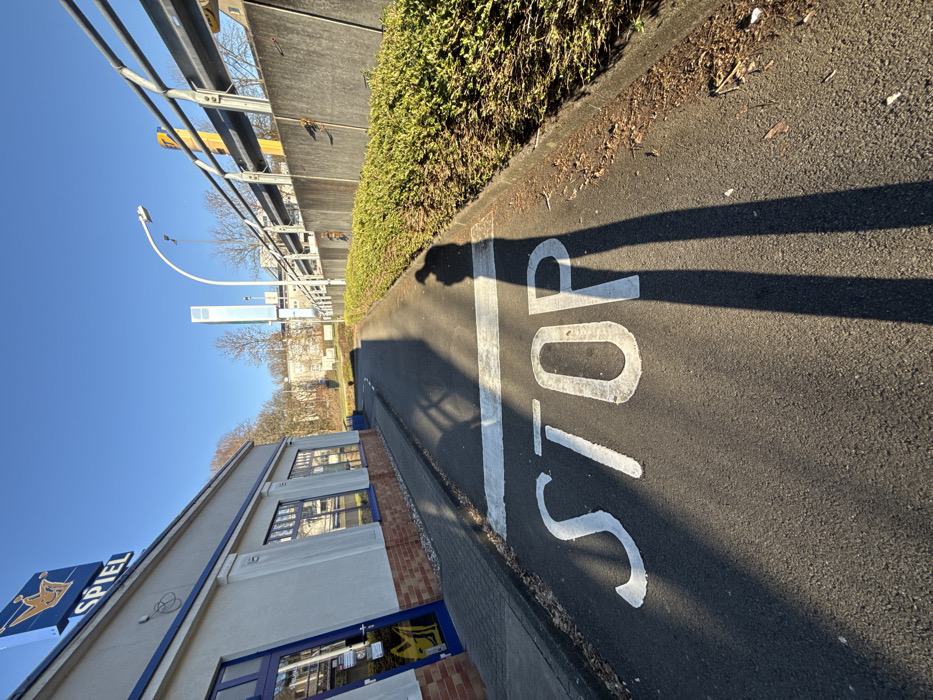 The image captures an outdoor scene on a sunny day with a clear blue sky, located in Remscheid, Germany, specifically near Bahnhofsplatz 2-4, in the vicinity of Remscheid Hauptbahnhof. In the foreground, an asphalt surface displays a prominent white painted "STOP" message with a preceding white stop line. The elongated shadow of a person, likely the photographer, extends from the lower right of the frame, falling across the "STOP" inscription. To the left, a single-story commercial building features light grey walls, blue trim around its windows and a blue entrance door, and a red brick lower section. A rooftop sign, partially visible, displays the word "SPIEL" with a golden crown emblem, indicative of a gaming establishment. Yellow graphics are visible on the blue entrance door. To the right, a low, well-maintained green hedge lines the edge of the asphalt, separated by a concrete curb. Beyond the hedge stands a tall, grey concrete retaining wall, topped with a silver metal guardrail. In the mid-ground, a modern white street light with a curved standard is visible. In the background, against the clear blue sky, a tall, slender, light-colored elevator tower, characteristic of the pedestrian bridge infrastructure at Remscheid Hauptbahnhof, stands prominently. Distant buildings and deciduous trees without leaves are also visible on a gentle incline.