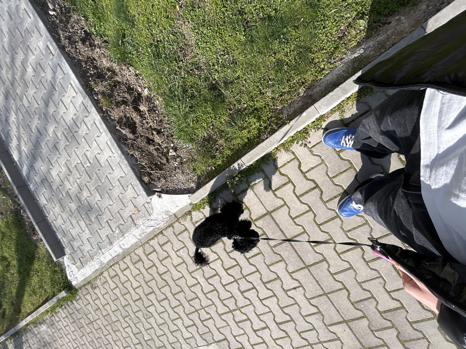 - "The scene depicts a first-person view of a person walking a black poodle-type dog on a paved pedestrian path in Elhovo, Bulgaria" by FM-lKpUb2, licensed under CC BY 4.0