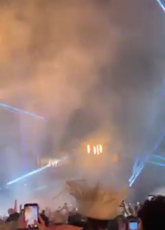 crowd of people at a concert, many holding up phones to record. Bright blue and green laser lights crisscross the sky, which is also filled with smoke and light from pyrotechnics. The stage is visible in the distance, emitting light and smoke. The audio suggests electronic dance music is playing.