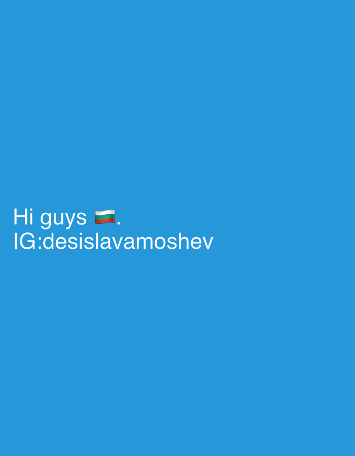 The image displays white text centered on a solid, uniform blue background. The upper line of text reads "Hi guys 🇧🇬.", featuring the Bulgarian flag emoji. Below this, the text "IG:desislavamoshev" is present. No people, discernible objects beyond the text, actions, or interactions are depicted. The environment is a digital display or graphic. No physical geographical location, including one within Mönchengladbach, Germany, is visually identifiable from the content of this image.