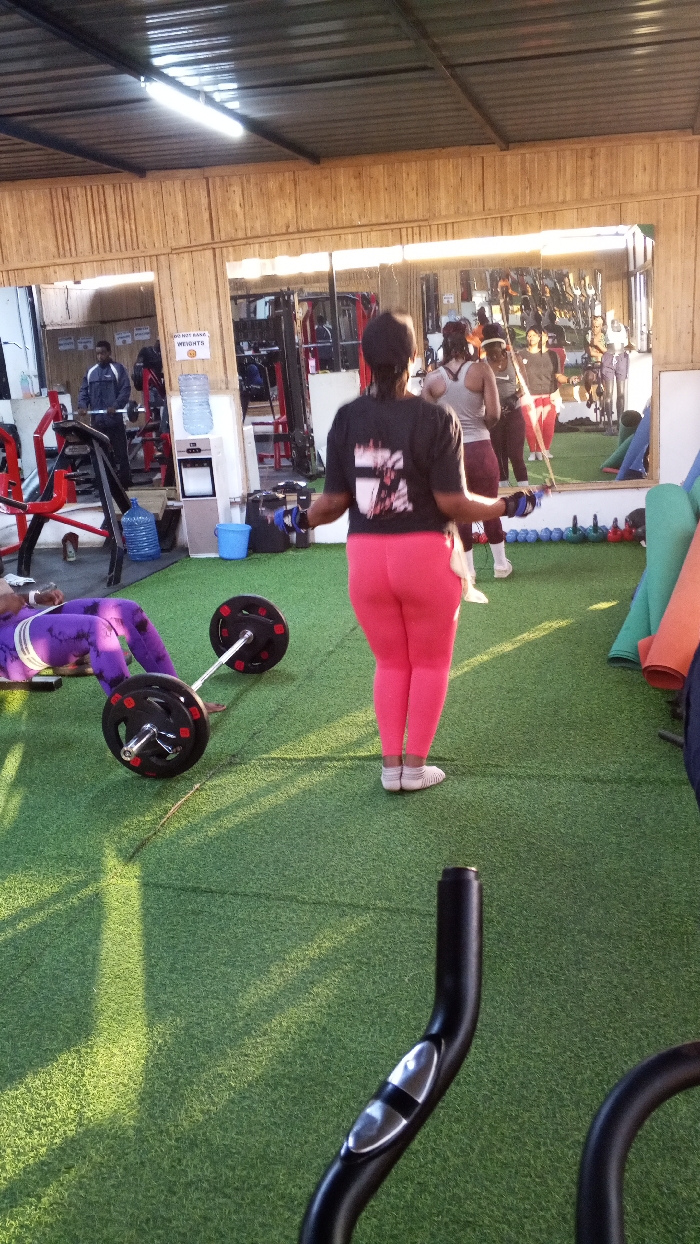 Inside a gym, a woman in pink leggings jumps rope on artificial grass. Another person wearing purple leggings is positioned under a barbell. A weight machine stands near a mirror reflecting additional individuals exercising. The gym features wood-paneled walls, a metal ceiling, a water dispenser, and exercise mats, creating a fitness-focused setting. Part of an exercise bike is visible in the foreground.