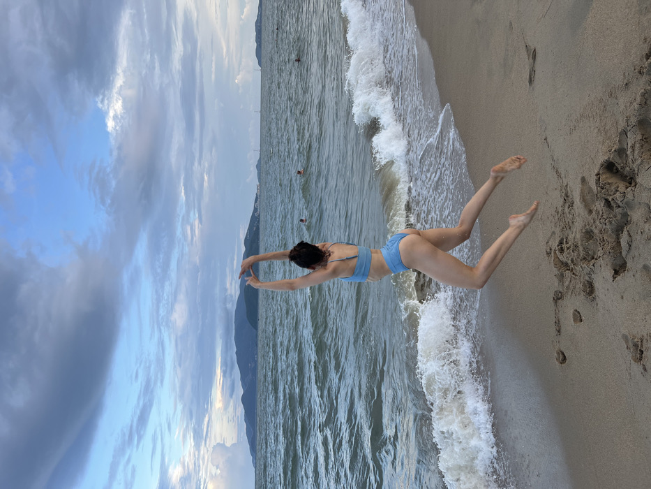 - "A light blue two-piece bikini-clad individual, appearing to be an adult female, is suspended mid-air in a jump on a light brown sandy beach" by FM-U93nI3, licensed under CC BY 4.0