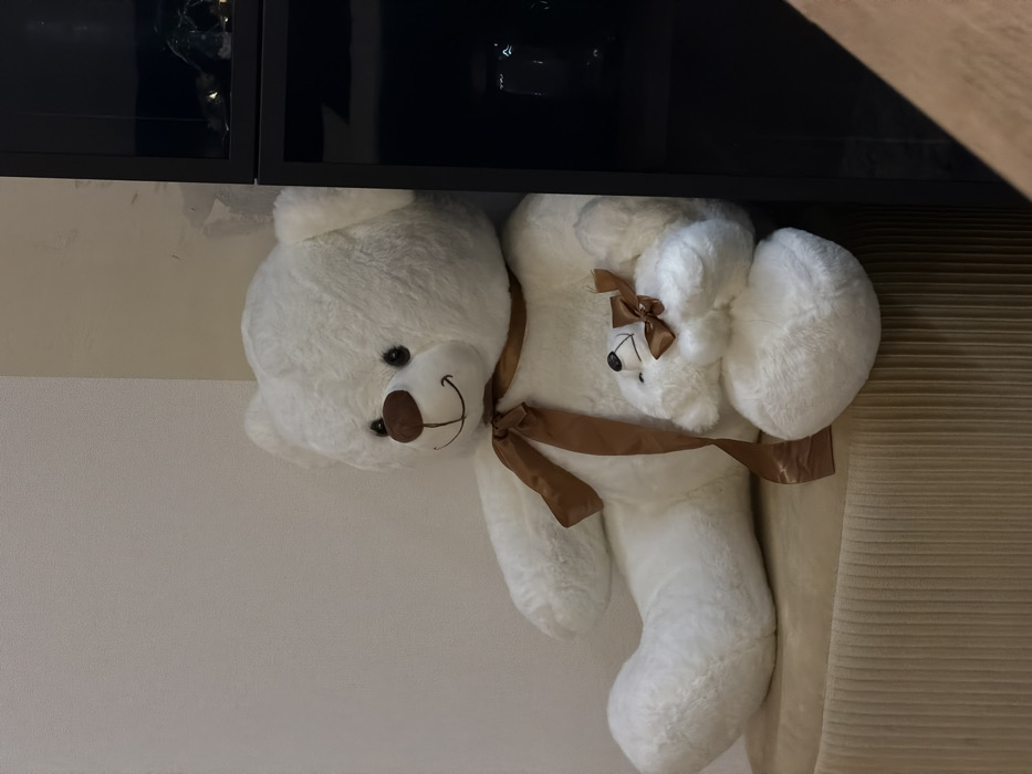 A large white teddy bear with a brown ribbon around its neck and holding a smaller teddy bear with a similar ribbon is situated in front of a white wall. The stuffed animals are positioned under a dark, possibly black, shelf or cabinet. A section of a beige-colored corrugated surface is visible on the right side, likely a bed or furniture piece.