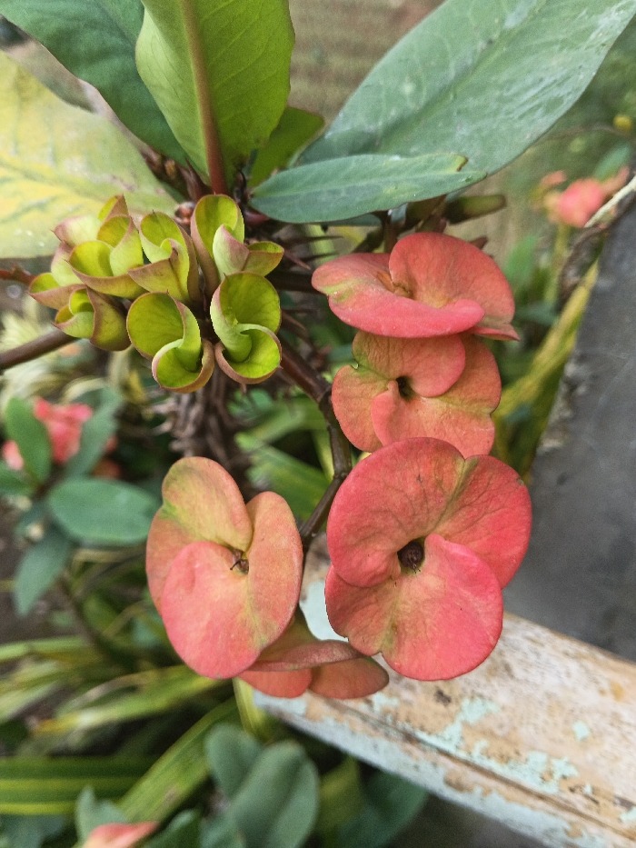 A close-up reveals a vibrant Crown of Thorns plant