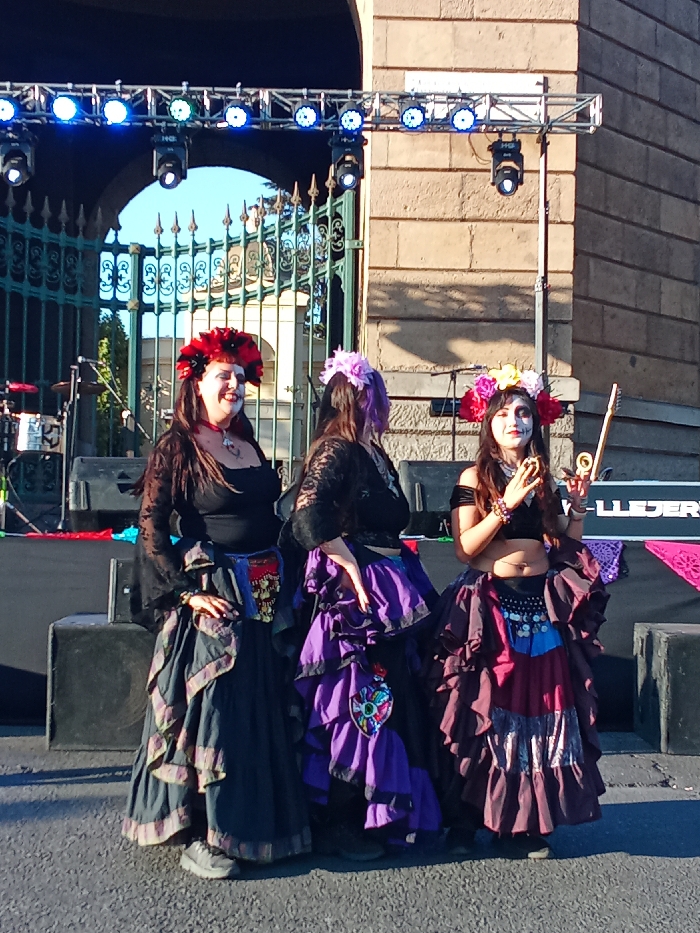 The scene depicts three adult females standing on a dark paved surface in Recoleta, Chile, in front of a stage setup and a large stone building featuring an arched gateway with an ornate metal gate. The event occurs during daylight. From left to right: 1. A female with dark hair wears a prominent red floral headdress. Her face is painted with white makeup and red accents around the eyes and mouth. She wears a black long-sleeved top with lace detailing, a long layered dark skirt with patterned trim, and a decorative belt pouch. She smiles and looks towards the viewer. Dark athletic shoes are visible. 2. A female with dark hair, possibly with purple highlights, wears a purple floral headdress. Her right profile is visible as she faces slightly towards the right. She wears a black long-sleeved top, a voluminous multi-layered purple and black skirt, and a decorative belt pouch. Her right hand rests on her hip. 3. A female with dark hair wears a multi-colored floral headdress. Her face is painted with white makeup, dark circles around the eyes, and a red mouth. She wears a black off-the-shoulder crop top revealing her midriff and a navel piercing, along with a voluminous multi-layered skirt in burgundy, purple, and blue. She holds a small, dark circular object in her left hand and a light-colored elongated wooden object in her right. Multiple bracelets are on her wrists. She looks towards the viewer with a slight smile. Behind the women, a metal stage truss system equipped with illuminated blue stage lights is visible. Black speaker cabinets are on the stage floor, along with a partial drum kit to the far left. A black banner with partial white lettering ("LLEDER") and a pink/purple patterned banner are positioned behind the subjects. The large stone building in the background has an arched entrance with an open ornate dark metal gate, through which a clear blue sky and distant structures are visible.