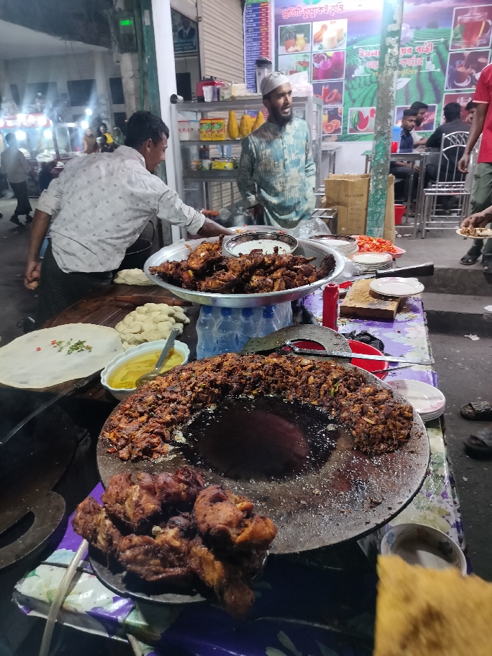 street food vendor preparing a meal in Charfasson Sadar, Bangladesh. The vendor is preparing a meal that includes fried chicken, a type of meat stew, and what appears to be flatbread. The meal is being prepared on a large, round, black pan. There is a pile of fried chicken pieces on the pan as well as a circular ring of the meat stew. There are also several plates of food on a nearby table, including what appears to be cooked chicken and vegetables. The image also shows a man wearing a brown shirt, a white shirt, and a white cap who appears to be observing the vendor's actions. To the right of the vendor's stand, a group of men is sitting at tables and eating. The vendor appears to be working at an outdoor stand that is in a densely populated area, likely a public marketplace. The vendor's area is brightly lit, and there are several lights in the background, including light fixtures and a sign with writing in an unknown language. The sidewalk and the street leading away from the vendor are paved. The vendor is standing next to a table covered in a brown cloth that holds the food. The food is being prepared on a large, black pan that sits on top of the table. There are also several empty plates and other food preparation tools on the table. The vendor is located on a street in Charfasson Sadar, Bangladesh. The street appears to be lined with other shops and businesses. The image captures a moment of everyday life in Charfasson Sadar, Bangladesh. The vendor is preparing a meal that is common in the region. The image also captures the hustle and bustle of the marketplace. The vendor is in the center of the image, with the other men and the food in the background. The focus of the image is on the vendor's food and how it is being prepared.