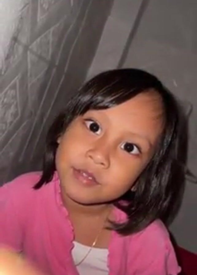 A girl with dark brown, shoulder-length hair is smiling and talking to the camera. She is wearing a pink shirt and a gold necklace with a white shirt underneath. The background is a white padded surface with a diamond pattern.