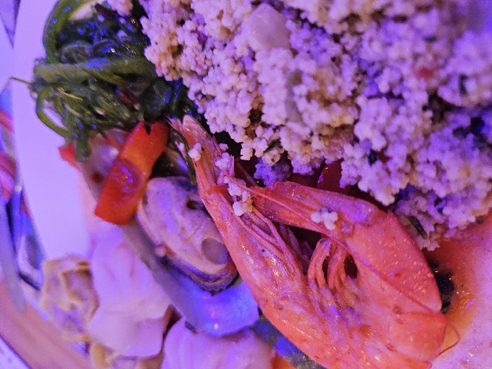 A close-up, high-angle image depicts a prepared meal served on a white plate in Audun-le-Tiche, France. The scene is illuminated by artificial lighting, casting distinct purple and pink hues across the food items. Prominently in the foreground are two cooked, head-on shrimp with orange-pink exoskeletons; one shrimp displays small white particulate matter on its shell. To the immediate left, two mussels are visible, one within a blue-black shell and another lighter-toned, partially open. A large mound of granular food, consistent with couscous or a similar grain salad containing discernible green and red flecks, occupies the right side of the plate. Above this, a portion of dark green, stringy seaweed salad is present, adjacent to a single red bell pepper slice. In the upper left background, several light-colored, folded items resembling dumplings or wontons are partially obscured. No individuals are visible.
