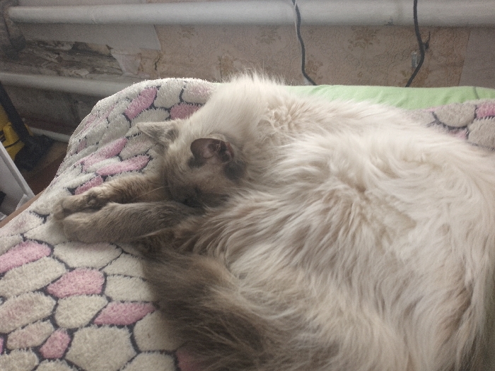 - "Within an interior setting in Krasnogorskoye, Russia, a long-haired feline, primarily cream or fawn-colored with darker brown points on its ears, face, paws, and tail, is observed sleeping in a tightly curled position" by FM-zZnPi1, licensed under CC BY 4.0