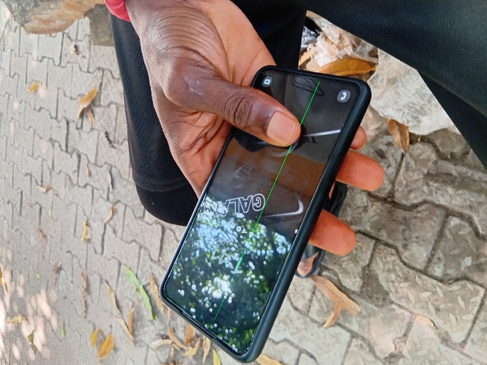 A close-up, downward-angled view depicts a person's right hand holding a black-cased smartphone horizontally, with a portion of their left leg visible. The person has dark skin and wears a red bracelet on the right wrist, black trousers, and a dark sandal on the left foot. The smartphone screen reflects green foliage and the word "GALAXY", featuring two distinct diagonal green lines. The ground is paved with grey interlocking concrete blocks, scattered with dried brown leaves. A crumpled clear plastic bag rests on the pavement near the left leg. The setting is outdoors, under partial shade, within the city of Ukukwa, Nigeria.