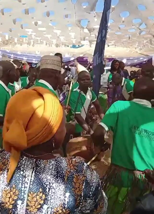 group of people dancing under a white tent with blue decorations. Most of the dancers are wearing green shirts, some with "BEL BWON PARYAN DISTRICT" printed on the back. One man is playing a drum. There are several people in the background wearing different outfits, and the camera is focused on the dancers and the drum player. The tent is open and allows sunlight to shine through. The video appears to be taken from within the crowd, slightly behind another person, based on the presence of a head covering and patterned clothing in the foreground.