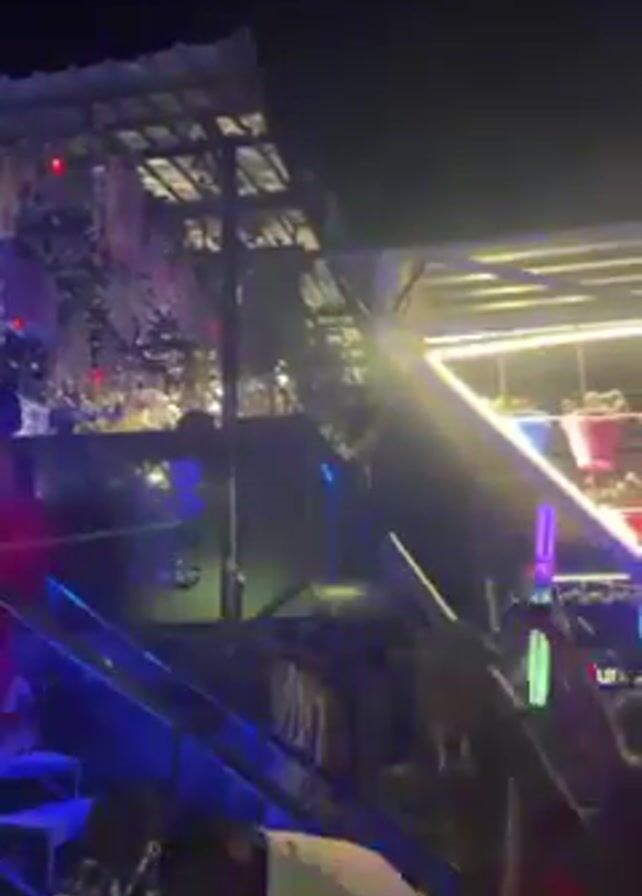 n outdoor nighttime scene with people dancing and raising their hands in the air at a party or event. There are flashing lights and music playing. The location has decorative elements including planters and an open roof structure. The scene is dark and illuminated by the party lights.