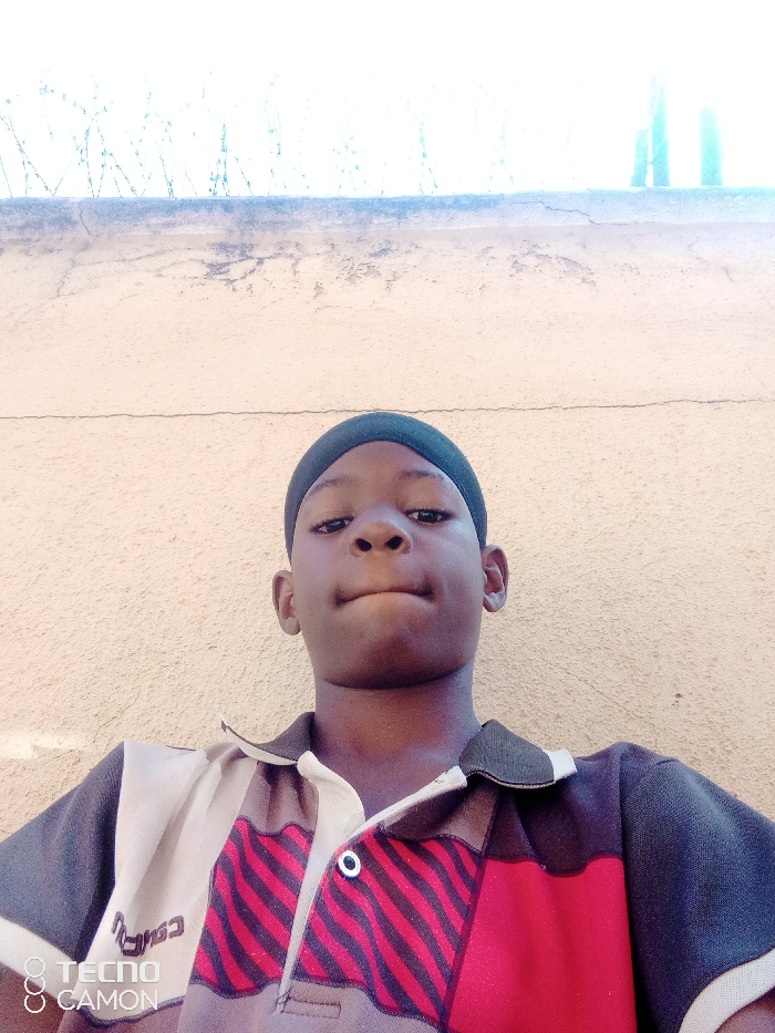 A headshot-style portrait features a young individual, likely male, with dark skin, centered within the frame