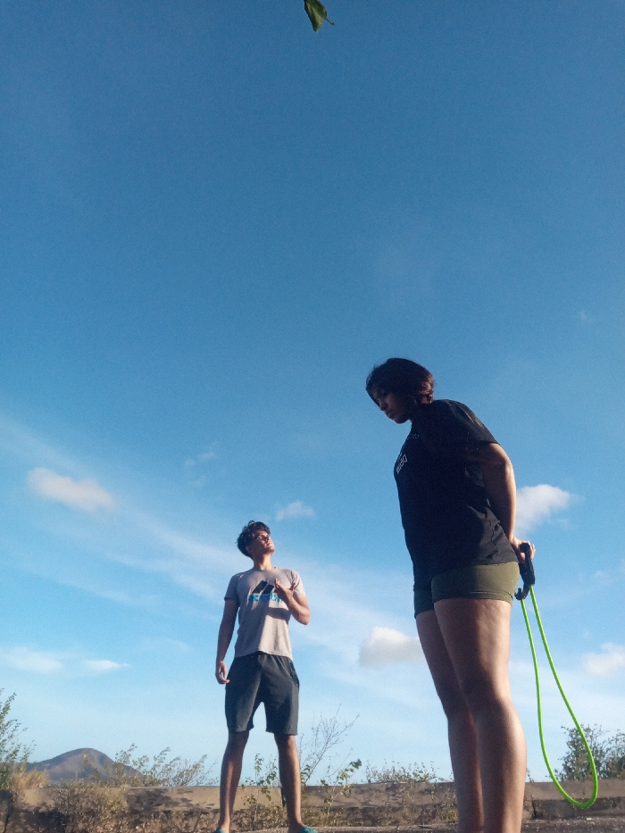 This image depicts an outdoor scene in Altagracia, Venezuela, under a clear blue sky with scattered white clouds. Two individuals are present. On the right, a female subject with dark hair, wearing a black t-shirt and olive green shorts, stands with her head tilted downwards. She holds a neon green jump rope behind her back with both hands. On the left, a male subject with dark hair and glasses, wearing a light grey t-shirt with an Adidas logo and dark shorts, stands looking upwards towards the sky, with his left hand slightly raised near his chest. A single green leaf is visible against the blue sky in the upper center of the frame. The background features dry, scrubby vegetation and a low dirt or concrete barrier in the midground, with a prominent brown hill or mountain visible on the far left horizon. The scene is brightly illuminated by natural sunlight.