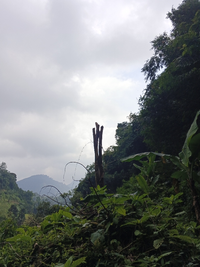 Lush green vegetation blankets a hillside under an overcast sky. In the foreground, various plants thrive, including banana trees with large, broad leaves. A cluster of broken tree trunks stands amidst the greenery. Distant mountains fade into the horizon under the cloudy sky. The overall scene evokes a sense of wild, natural beauty.