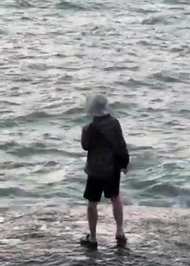 A person in a bucket hat, flannel shirt, shorts, and sandals, is standing on a rock-covered edge, throwing something into the water. The water is rough, with many whitecaps.