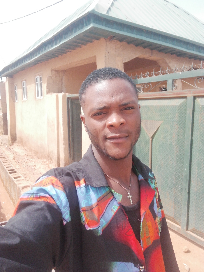 A medium close-up image depicts a male individual, appearing to be in his late 20s or early 30s, posing for a selfie in the city of Bahit, Nigeria