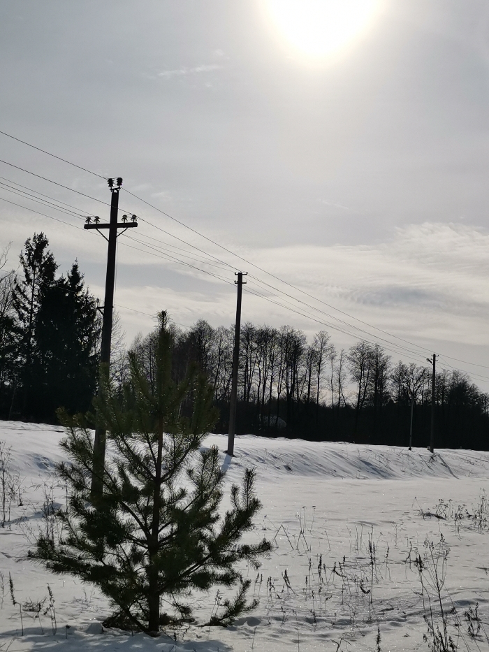 This image depicts a snow-covered rural landscape located in Лосева, Belarus. In the foreground, a small, green coniferous tree stands centrally amidst a field of undisturbed snow. Scattered dry vegetation protrudes from the snow around the tree. The middle ground features two wooden utility poles supporting multiple overhead lines, extending horizontally across the frame. The pole on the left is equipped with a crossarm and insulators, while the pole on the right is a single, upright post. A dense line of leafless deciduous trees forms a dark silhouette across the horizon, bordering the snow-covered field. The sky is bright and hazy, with the sun visible as a diffuse, overexposed disc in the upper right quadrant. No individuals or vehicles are present in the scene.