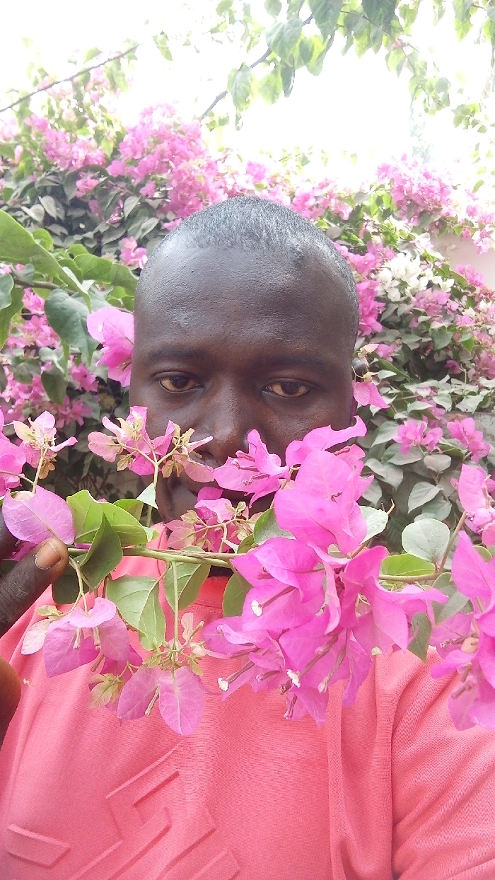 A close-up, vertical photograph depicts an adult male positioned amidst dense flowering bougainvillea in the city of Dakata, Nigeria